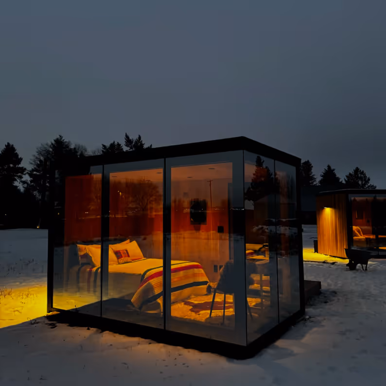 Private, glass-walled cabins designed for immersive forest views and modern comfort.